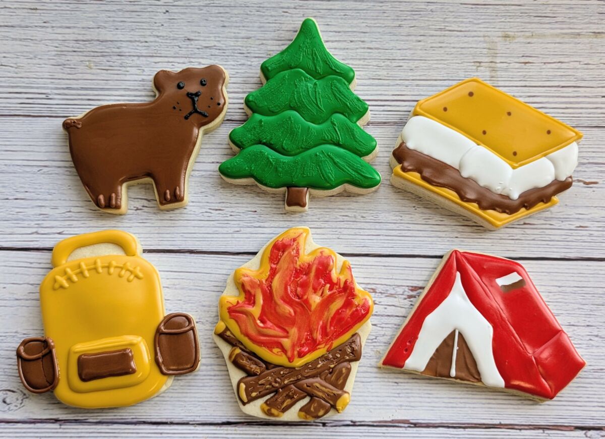 In this class, participants will receive 6 cookies, which will include a variety of the camping themed cookies shown here. We’ll go step by step to show you the sugar cookie way, including our usual class techniques of working with royal icing to base flood cookies, how to create wet-on-wet designs, and how to use stiffer designs to create texture and finishing touches on your cookies. You’ll also receive our royal icing recipe to practice your cookie decorating skills at home!